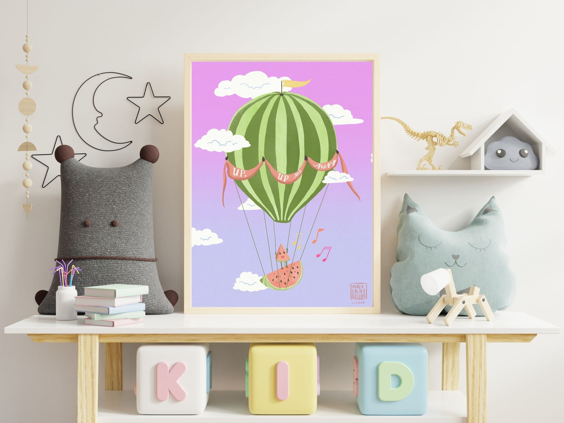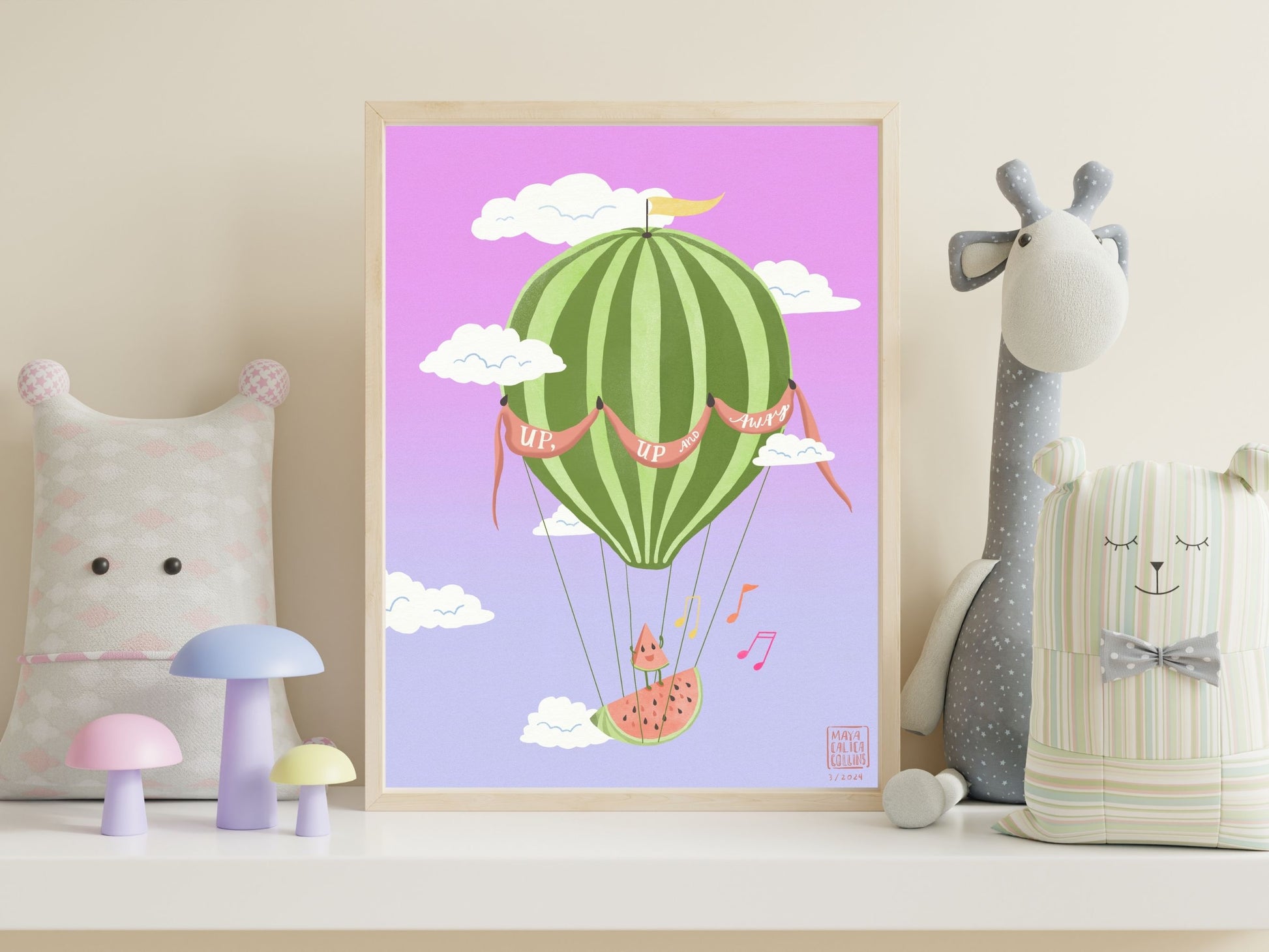 This is a fun art print of a watermelon hot air balloon, with a cute melon slice singing while riding it! The perfect gift for a child or child-like grownup who loves kawaii (cute) art. Great for a birthday, housewarming, christening or Christmas gift. This will look fabulous in a child’s nursery, work or creative space, and in the kitchen. These matte-finish art prints will bring some ✨sparkle✨ to any space.