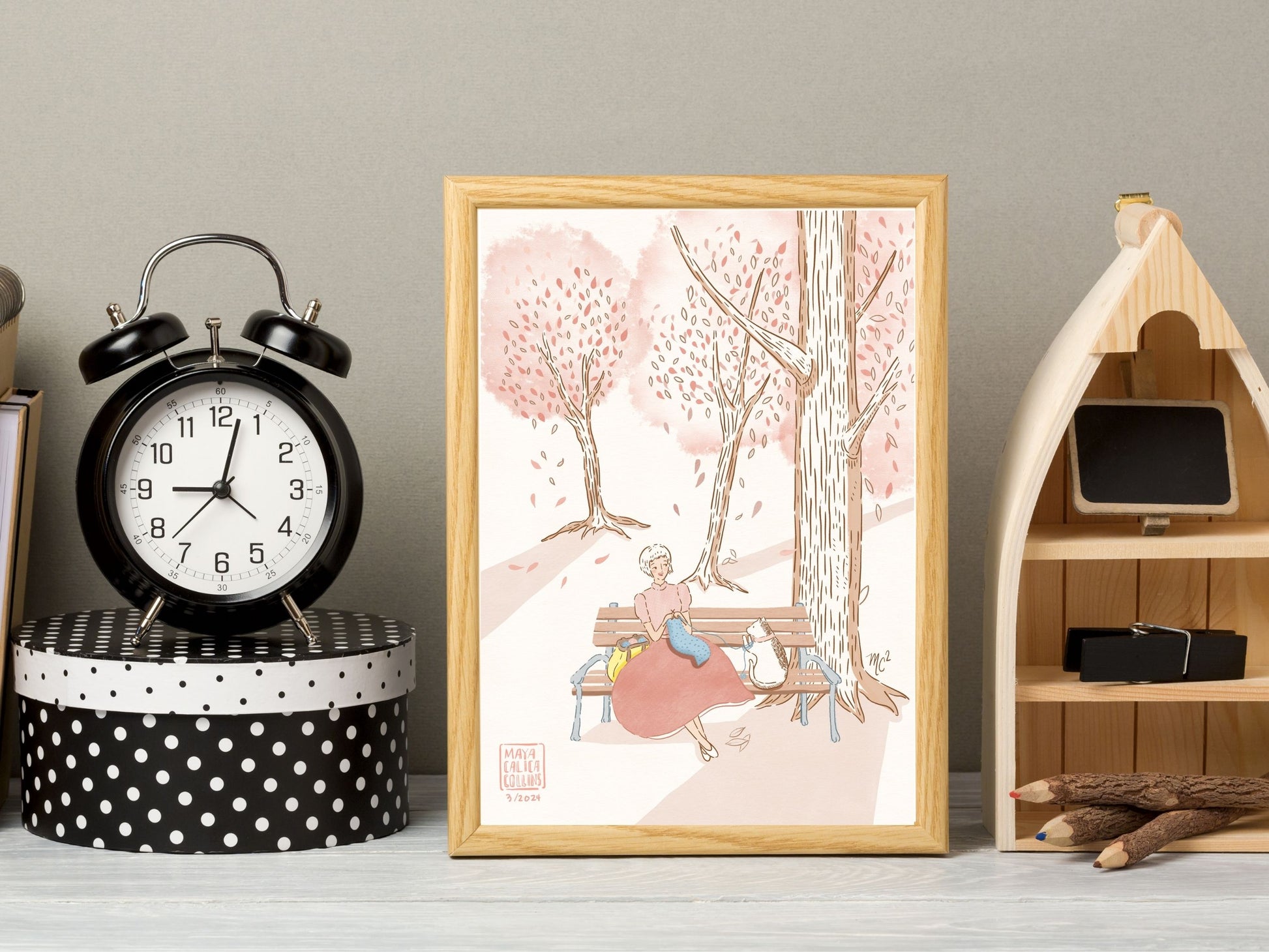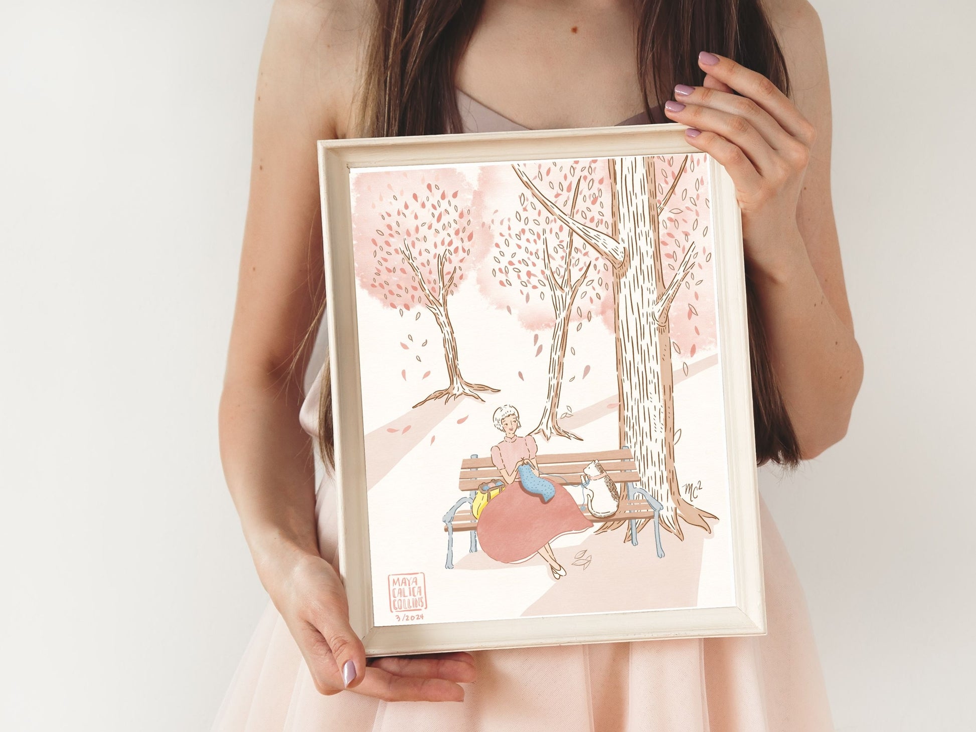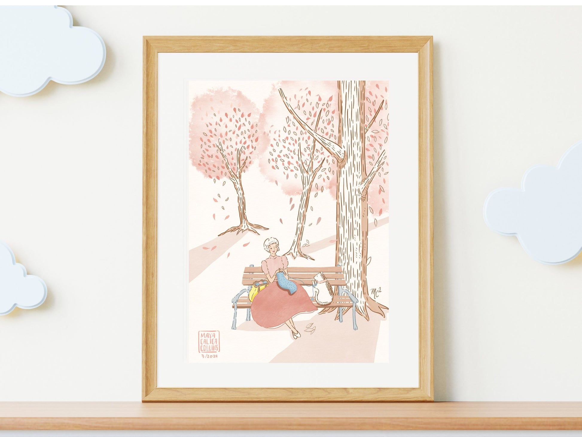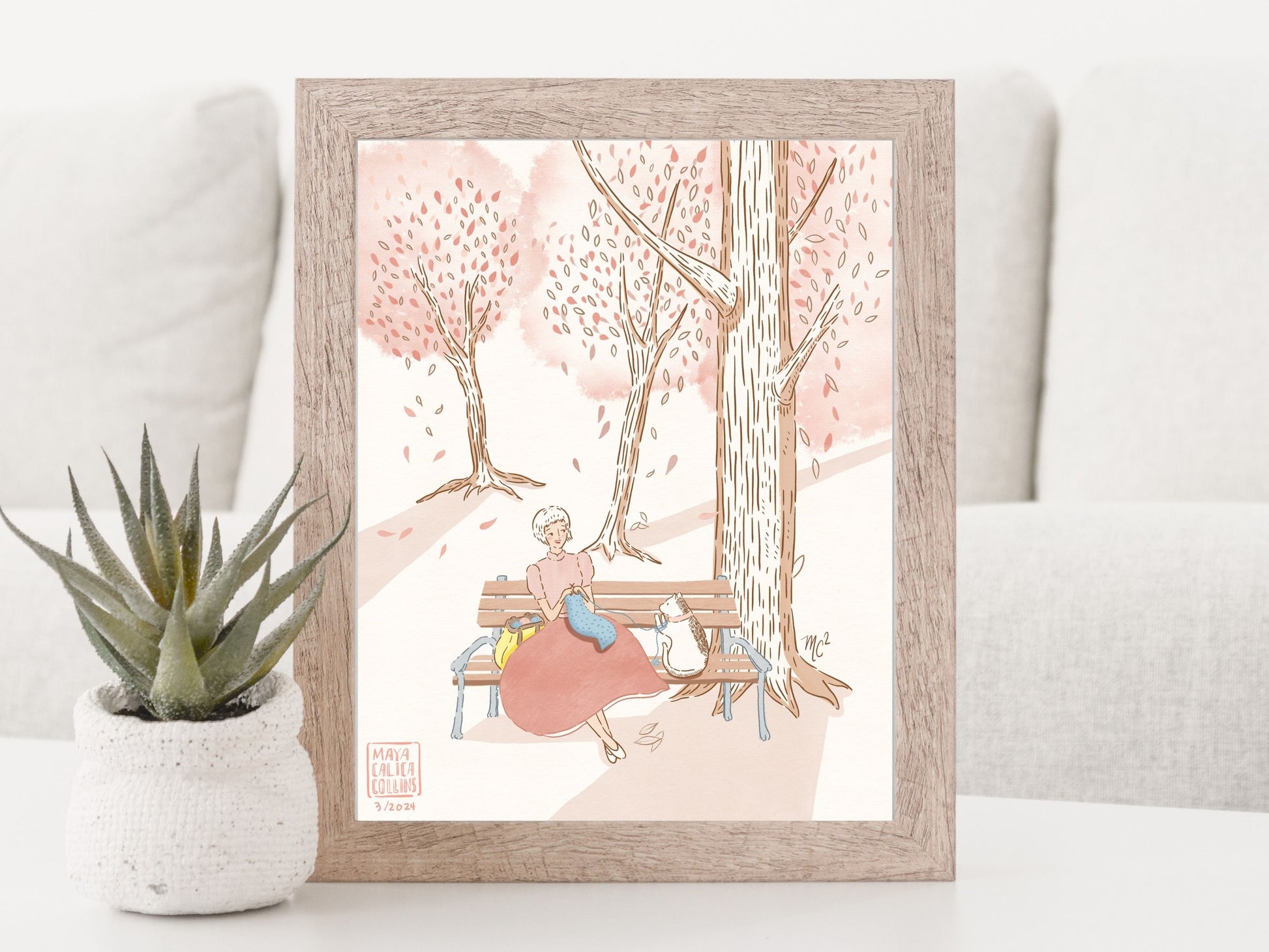 This art print of a girl knitting on a park bench, with her cat assisting with the wool, is set with cherry blossoms in the background. A calm scene to decorate a bedroom, a craft room or your favourite spot in the house.